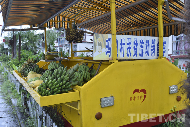 圖為林芝市墨脫縣墨脫鎮(zhèn)瑪?shù)洗宸鲐毩鲃愉N售車上售賣的香蕉、香櫞等水果 攝影:王媛媛