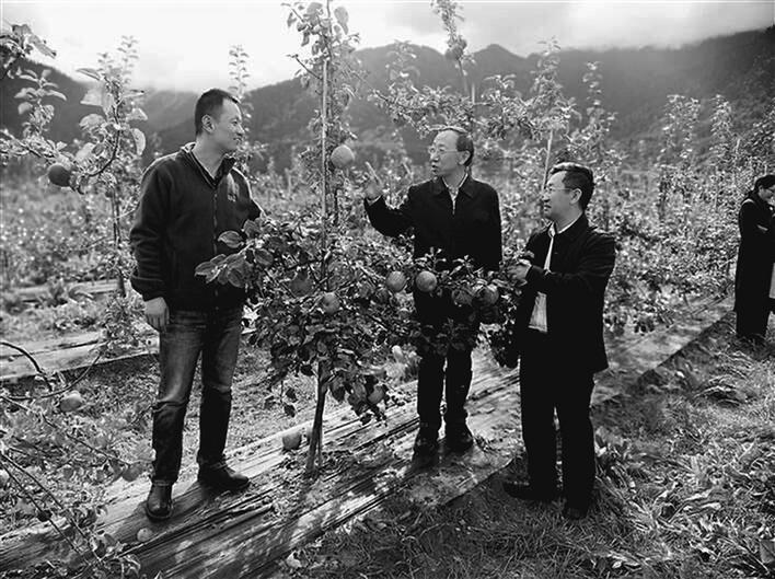 國(guó)家蘋(píng)果產(chǎn)業(yè)技術(shù)體系首席科學(xué)家霍學(xué)喜(中)在米林縣羌納蘋(píng)果示范基地現(xiàn)場(chǎng)開(kāi)展技術(shù)指導(dǎo)。西藏日?qǐng)?bào)記者 李梅英 攝