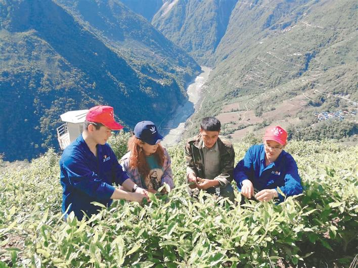 圖為華能雅江公司駐村干部與當(dāng)?shù)匕傩找黄鸩榭床枞~長勢。記者 楊小娟 攝