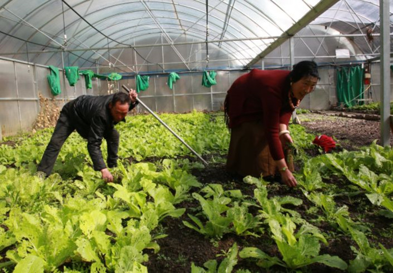 圖為嘎達(dá)彭措(左一)與妻子在蔬菜大棚忙碌 圖片來源:康巴傳媒