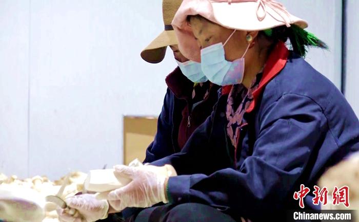 圖為11月17日,西藏日喀則市謝通門縣農(nóng)牧民在該縣一生物科技企業(yè)清理食用菌。中新社記者 貢桑拉姆 攝