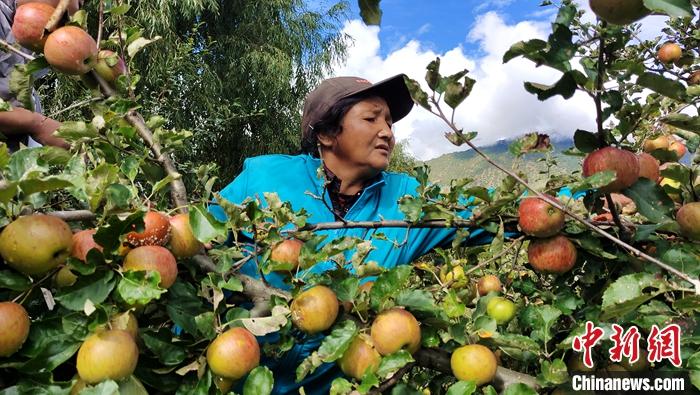 圖為10月6日,西藏林芝市米林縣參與種植蘋果的農(nóng)民采摘蘋果。中新社記者 貢桑拉姆 攝