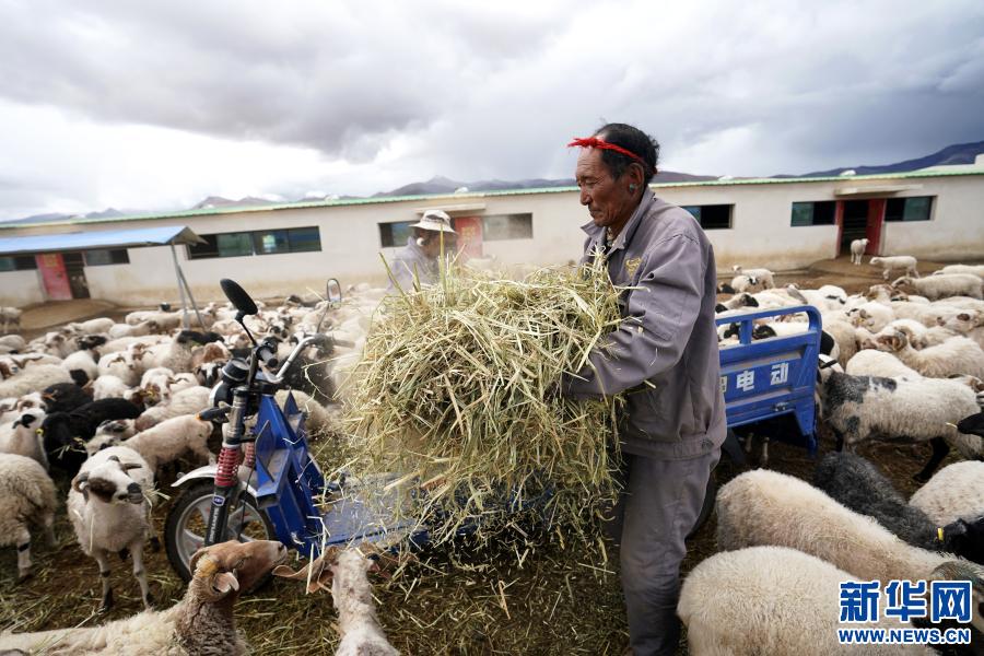 西藏日喀則市定日縣克瑪鄉(xiāng)幫布村村民頓珠在定日縣珠穆朗瑪崗巴羊規(guī)?;B(yǎng)殖產(chǎn)業(yè)園喂羊(7月31日攝)。頓珠2020年來(lái)到產(chǎn)業(yè)園打工,負(fù)責(zé)喂羊、打掃羊舍,每個(gè)月有3500元的收入。新華社記者 詹彥 攝