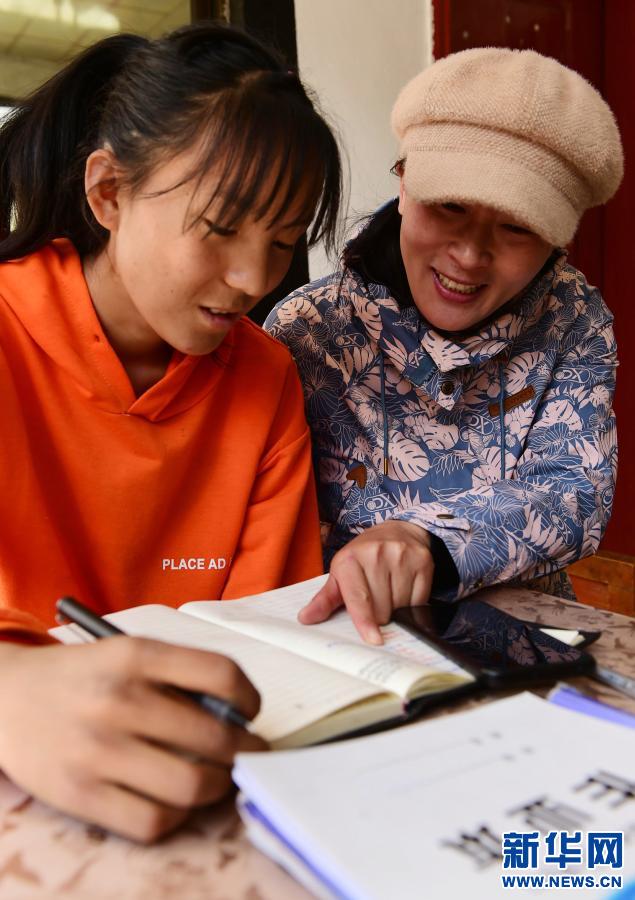 2020年3月26日,在西藏林芝市朗縣扎西塘村的一戶建檔立卡貧困戶家中,西藏林芝市委宣傳部駐村工作隊員何曉雪(右)正在為學生輔導功課。 新華社發(fā)(索朗羅布 攝)
