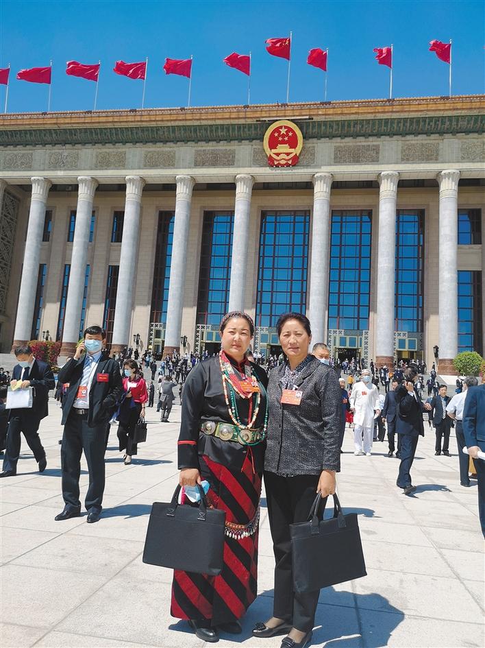 圖為貢覺(jué)曲珍(左)在會(huì)場(chǎng)外與西藏參會(huì)委員合影留念。(圖片由貢覺(jué)曲珍提供)