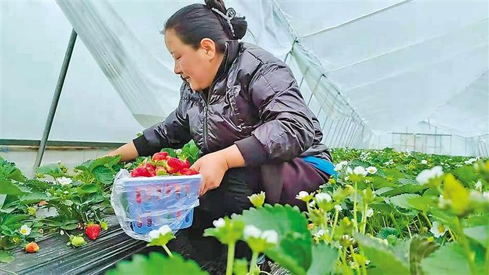 圖為達(dá)瓦在溫室大棚里采摘草莓。 記者 胡文 通訊員 范清梅 攝