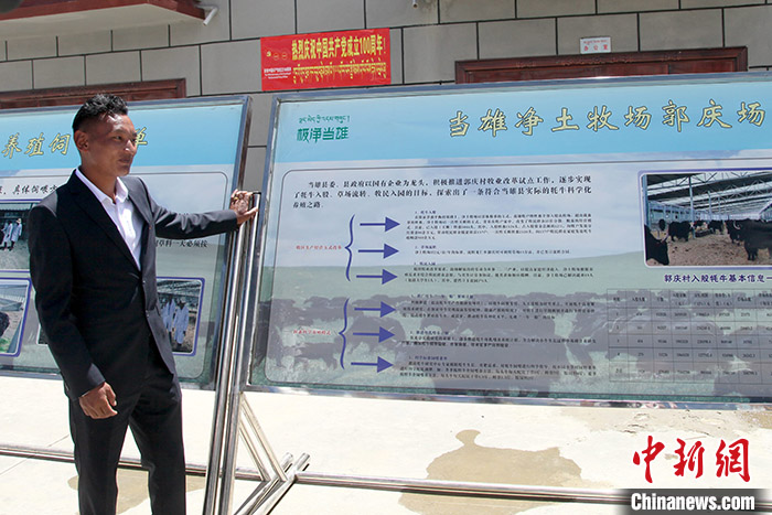 圖為6月2日,凈土牧場(chǎng)郭慶場(chǎng)負(fù)責(zé)人阿旺多布杰向記者介紹相關(guān)情況。 中新社記者 陳小愿 攝