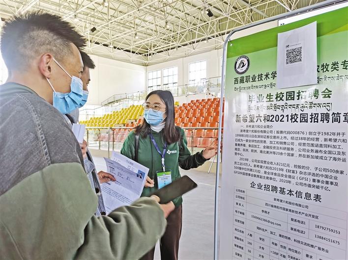 圖為西藏職業(yè)技術(shù)學(xué)院2021屆農(nóng)牧類專業(yè)畢業(yè)生校園招聘會(huì)現(xiàn)場(chǎng),新希望六和股份有限公司工作人員向?qū)W生介紹招聘信息。記者 王莉 攝