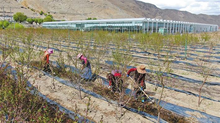 圖為當?shù)厝罕娫诳ㄈ玎l(xiāng)大桃種植基地里干農活。記者 裴聰 格桑倫珠 攝