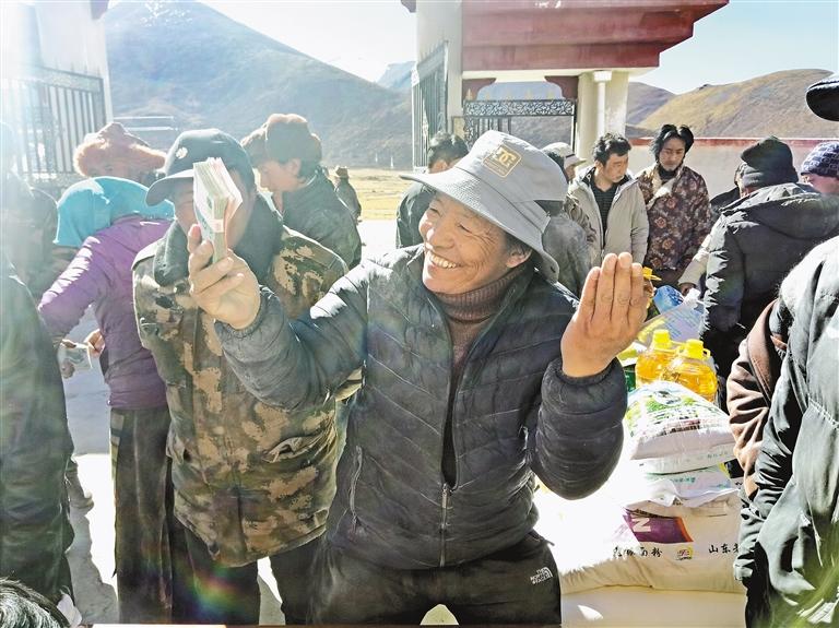 圖為嘉黎縣夏瑪鄉(xiāng)坡?tīng)杺}(cāng)村村民洛桑拿到分紅后,喜笑顏開(kāi)。 記者 萬(wàn)靖 攝