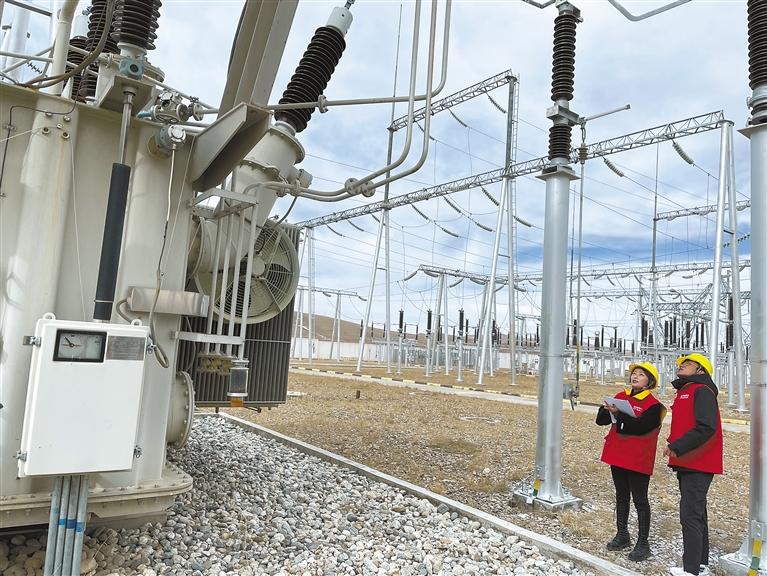 圖為國(guó)網(wǎng)那曲供電公司變電運(yùn)檢中心員工在對(duì)110千伏那曲變電站設(shè)備進(jìn)行檢查。記者 萬(wàn)靖 攝