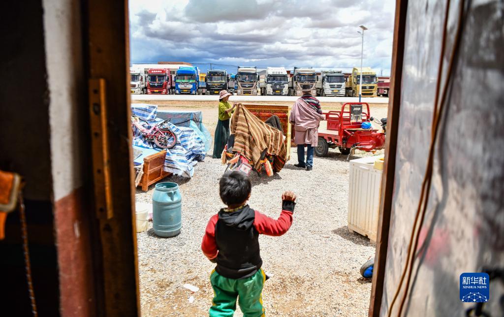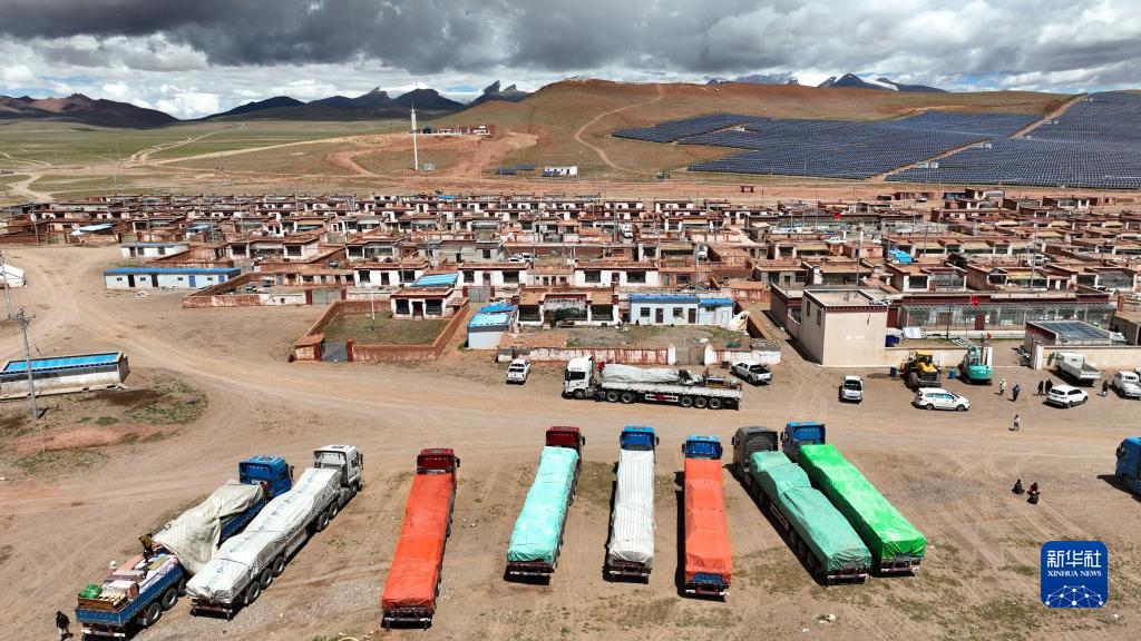 在雙湖縣多瑪鄉(xiāng)仲魯瑪村,運(yùn)輸家具的貨車(chē)整裝待發(fā)(7月13日攝,無(wú)人機(jī)照片)。新華社記者 晉美多吉 攝