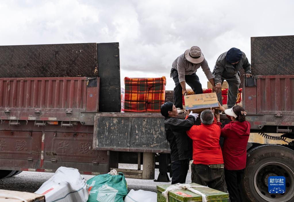雙湖縣多瑪鄉(xiāng)果根擦曲村的村民將行李搬上貨車(chē)(7月12日攝)。新華社記者 周荻瀟 攝