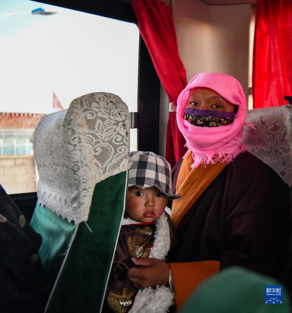 雙湖縣多瑪鄉(xiāng)果根擦曲村牧民次仁央金(右)乘坐大巴,準(zhǔn)備前往森布日安置點(diǎn)(7月19日攝)。新華社記者 晉美多吉 攝