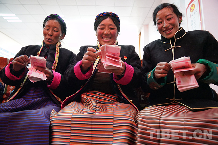 圖為領到工資的部分放牧員家屬正在數(shù)錢。攝影:曲杰