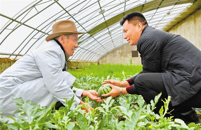 圖為措勤縣農(nóng)牧業(yè)技術(shù)推廣站站長吾金次仁(右)和措勤縣高原生態(tài)畜牧業(yè)現(xiàn)代化養(yǎng)殖一體化產(chǎn)業(yè)綜合基地合作社負責人扎西桑布在西瓜大棚里交流。 新華社記者 張汝鋒 攝