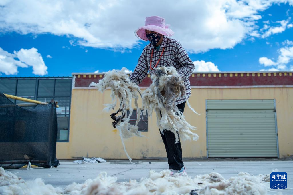 一位村民在晾曬羊毛(8月24日攝)。新華社發(fā)(旦增努布 攝)