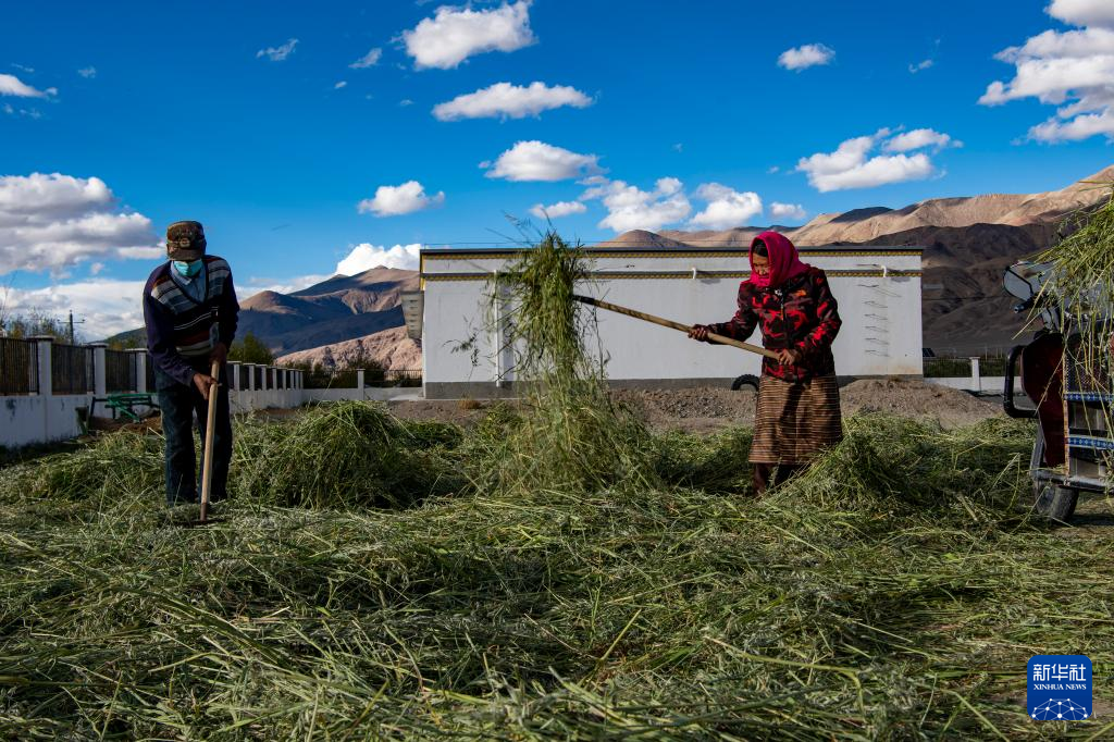 阿里地區(qū)噶爾縣昆莎鄉(xiāng)噶爾新村村民在場院晾曬紫花苜蓿(9月20日攝)。新華社記者 姜帆 攝