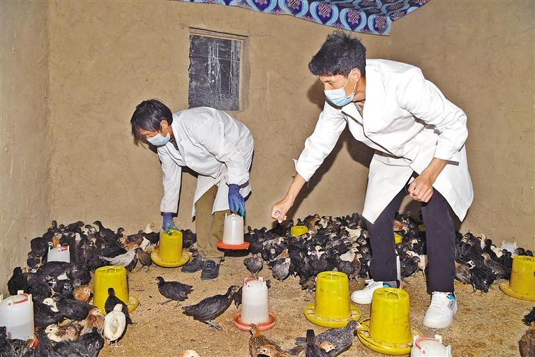 定日縣尼轄鄉(xiāng)藏雞養(yǎng)殖合作社社員在喂養(yǎng)藏雞。記者 李洲 攝