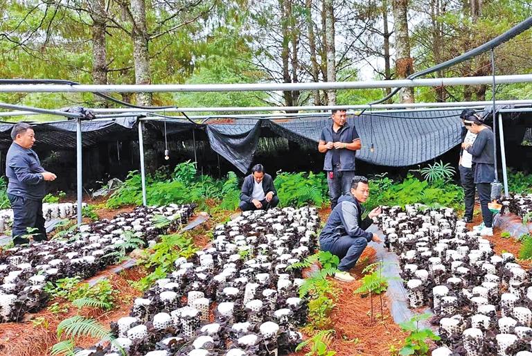 林芝市墨脫縣格當(dāng)鄉(xiāng)林下資源合作社技術(shù)員查看木耳長(zhǎng)勢(shì)。