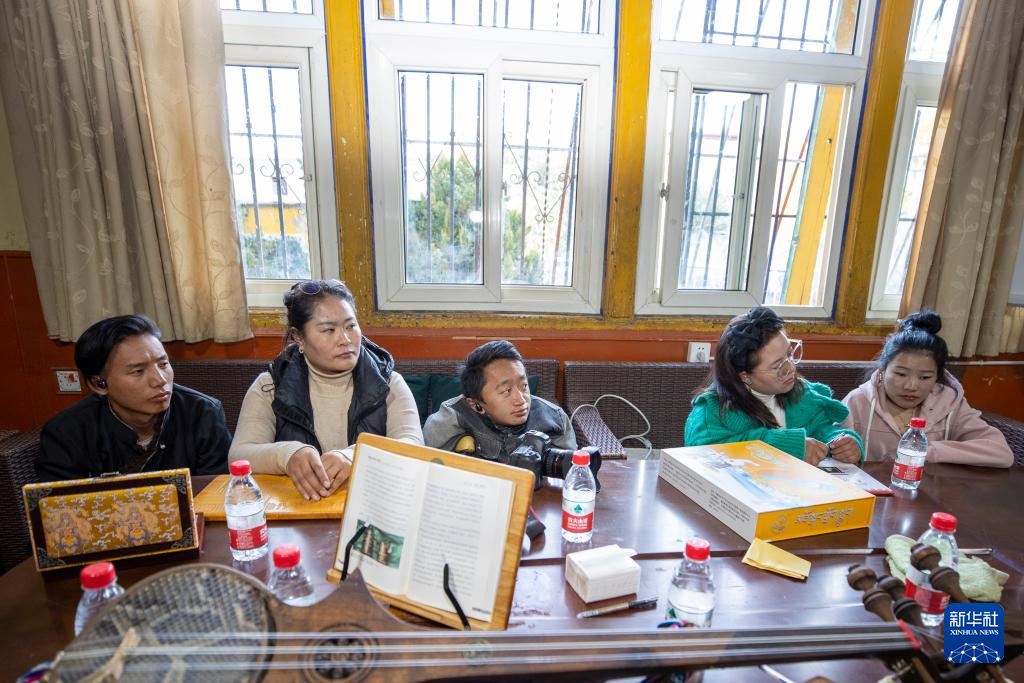西藏拓崗文化傳播有限公司負責人覺列(右一)在直播前與直播團隊討論直播方案(11月10日攝)。新華社記者 姜帆 攝