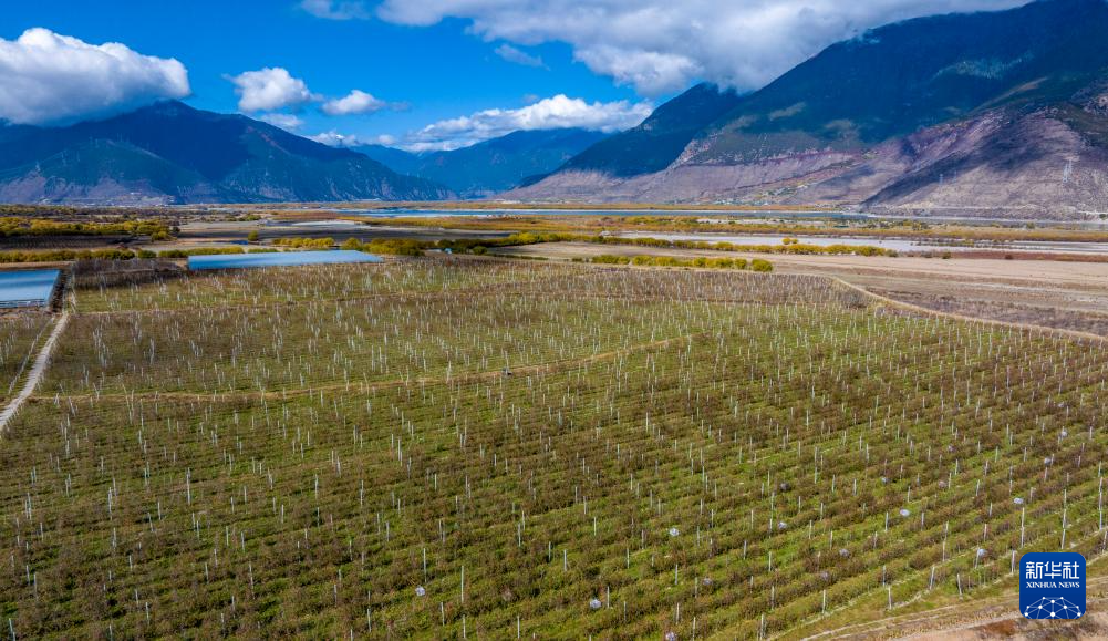 鳥瞰米林市羌納鄉(xiāng)西藏林芝現(xiàn)代蘋果標(biāo)準(zhǔn)化園區(qū)(無人機(jī)照片,11月13日攝)。新華社記者 姜帆 攝