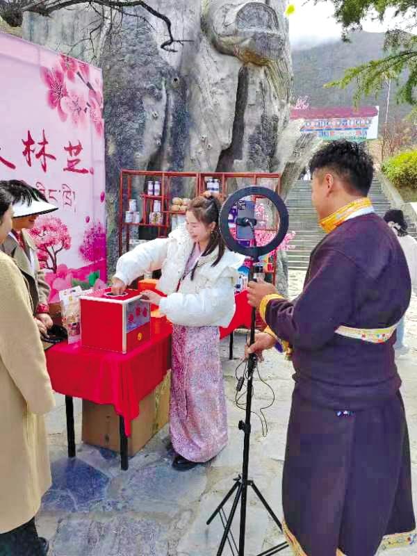 林芝市職業(yè)技術(shù)學(xué)校學(xué)生在嘎拉村直播,宣傳推介桃花旅游文化節(jié)、工布民俗風(fēng)情及農(nóng)特產(chǎn)品等。 記者 謝筱純 王珊 攝