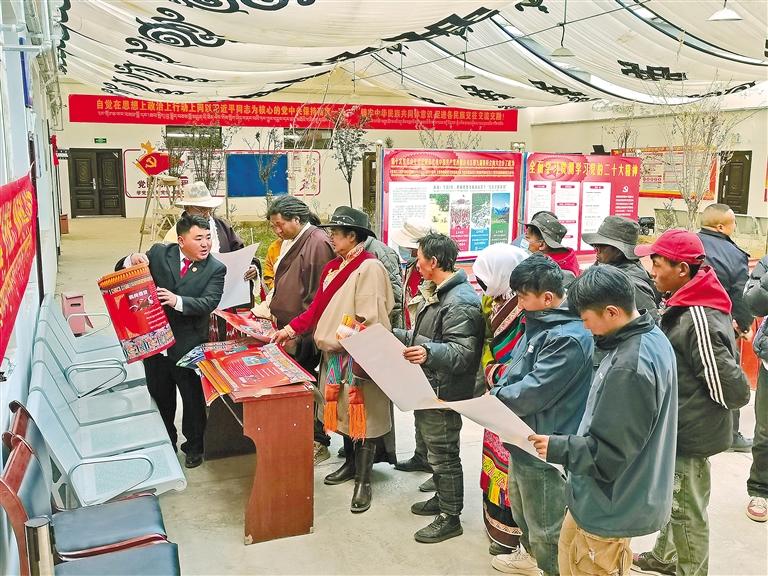 那曲市雙湖縣措折羅瑪鎮(zhèn)第三屆“鄉(xiāng)村振興 那曲奮進(jìn)”活動(dòng)中,法庭干警(左一)向群眾進(jìn)行普法宣傳。