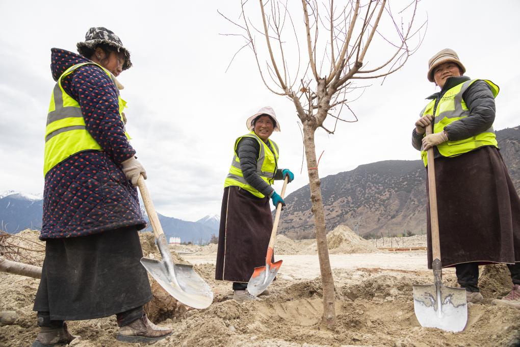 3月30日,西藏林芝市巴宜區(qū)林芝鎮(zhèn)嘎拉村村民尼瑪曲吉(中)與姐妹們一起在尼洋河灘上種樹。新華社記者丁增尼達 攝