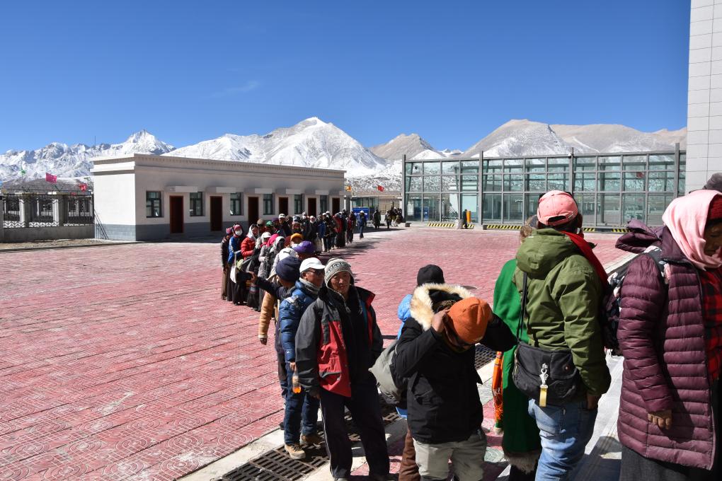 排隊等待從里孜口岸入境的民眾。(受訪者供圖)