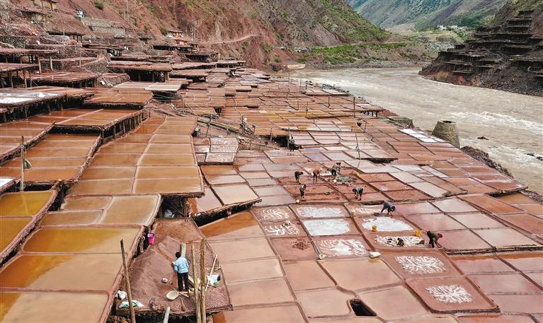 9月,瀾滄江的高山河谷坡地上,一年曬鹽季進(jìn)入尾聲。昌都市芒康縣納西民族鄉(xiāng)加達(dá)村村民例行修補(bǔ)1300多歲的鹽田。據(jù)了解,加達(dá)村從事鹽業(yè)生產(chǎn)的有300多戶,有大小鹽田2700多塊。