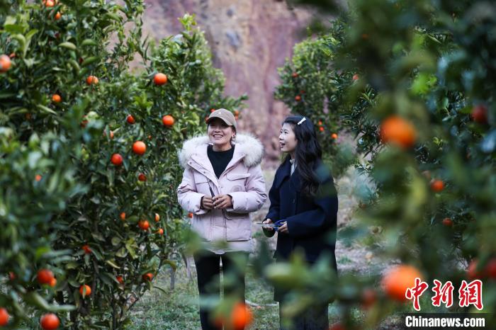 12月20日,冬至前夕,西藏自治區(qū)昌都市芒康縣納西民族鄉(xiāng)加達(dá)村橘子園里一片繁忙景象。納西民族鄉(xiāng)地處瀾滄江河谷,以山地為主,瀾滄江穿境而過,河谷地帶土地肥沃,黃澄澄的康巴蜜橘掛滿枝頭,果農(nóng)們穿梭其中,熟練地采摘已成熟的果實。圖為游客在橘子園中自拍留念。中新社記者 薛蒂 攝