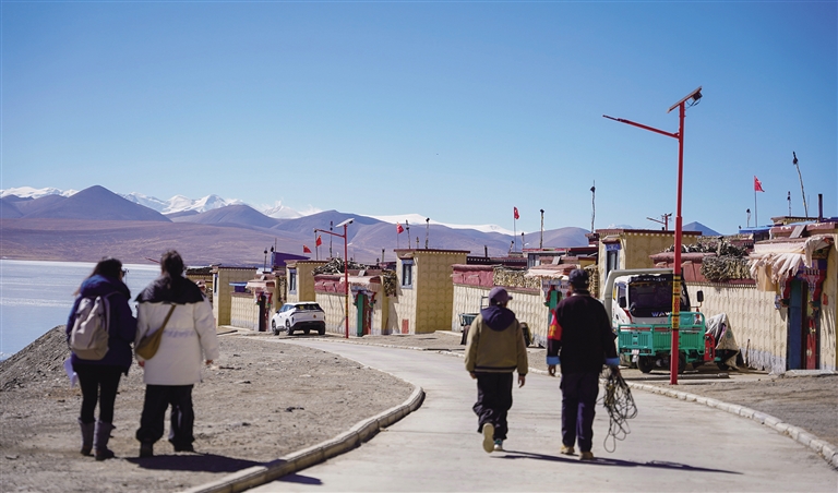 浪卡子縣打隆鎮(zhèn)推瓦村,南部與不丹接壤,邊界線長達(dá)25公里,是世界上海拔最高的純牧業(yè)行政村之一。全村共有40戶人家,153位村民在此生活。2月6日,記者踏入推瓦村,首先映入眼簾的是遠(yuǎn)處的普姆擁措湖,湖面在陽光的照耀下波光粼粼,與錯(cuò)落有致的雪山相互映襯,構(gòu)成一幅絕美的畫面。沿著平坦的柏油馬路前行,道路兩旁整齊排列的路燈和一排排以溫馨黃色為主色調(diào)的邊境小康房格外引人注目。漫步在臨近冰湖的村路上,悠然愜意之感油然而生,雪山、湖泊、村落與村民們和諧相融,共同繪就了一幅寧靜祥和的鄉(xiāng)村畫卷。