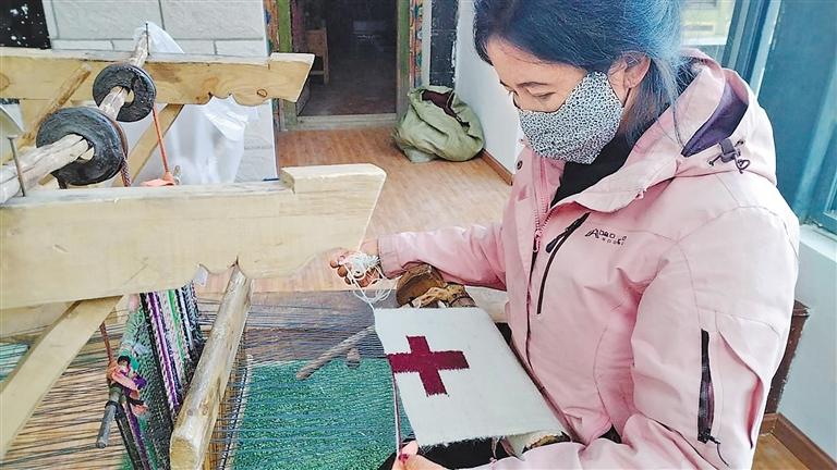 在這里,一場編織技能培訓(xùn)正在進(jìn)行,婦女們的雙手在織線之間來回游走穿梭,正專注地編織著藏式包、卡墊等各種手工藝品。