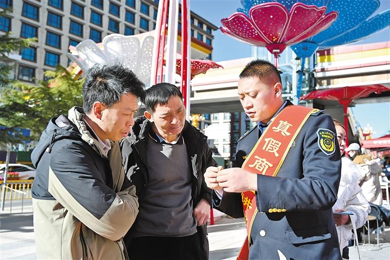 圖為桑珠孜區(qū)市場監(jiān)管局投訴舉報中心負(fù)責(zé)人李良友(右)向市民講解商品真假辨別方法。記者 扎西頓珠 攝