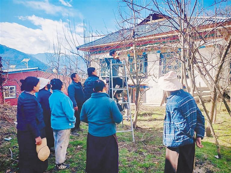 圖為永珠旦增為村民進行交叉枝修剪示范。記者 劉楓 謝筱純 通訊員 錢于 攝