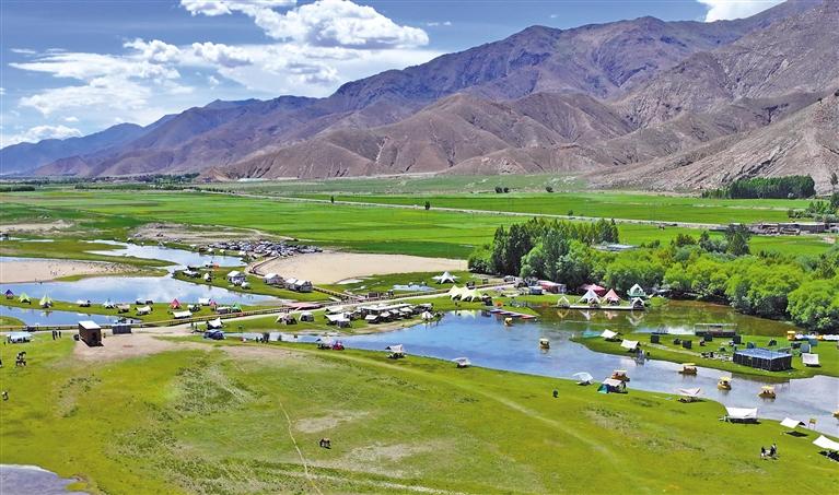 楚貴林卡位于日喀則市桑珠孜區(qū)東嘎鄉(xiāng)楚貴村。2019年初,青島援藏組規(guī)劃盤活村集體用地,打造以自然生態(tài)景觀、休閑度假旅游及異域農(nóng)耕民俗文化體驗(yàn)為主題,融合當(dāng)?shù)匚幕瘍?nèi)涵的“楚貴村生態(tài)旅游度假區(qū)”項(xiàng)目。項(xiàng)目自2022年啟動(dòng)以來(lái),隨著運(yùn)營(yíng)漸趨成熟,林卡休閑游樂(lè)設(shè)施逐年豐富。如今,這里設(shè)有咖啡休閑館、山地摩托、真人CS、游船、騎馬等多個(gè)傳統(tǒng)與現(xiàn)代結(jié)合的項(xiàng)目,受到游客青睞。