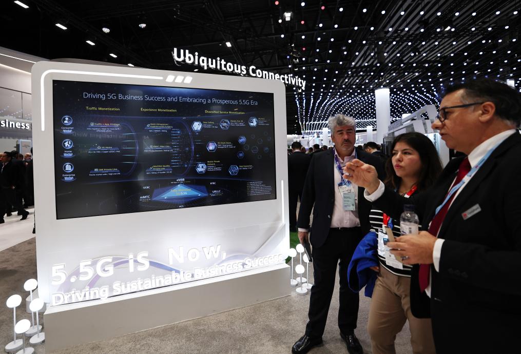 2月28日,在西班牙巴塞羅那舉行的2024年世界移動通信大會上,人們在華為展臺關注5G-A技術。新華社記者高靜 攝