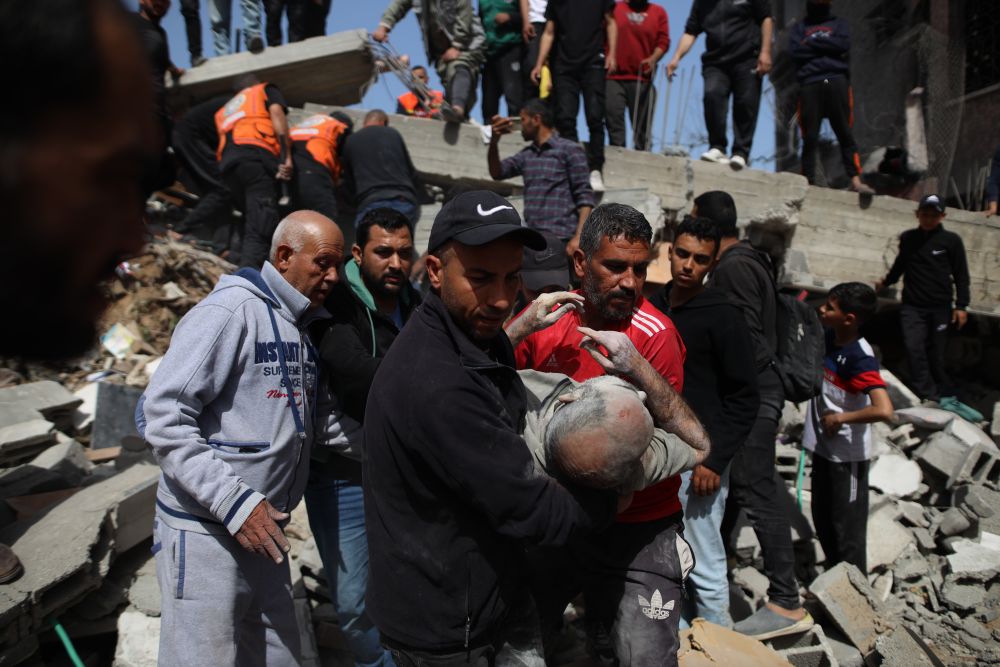 3月31日,在加沙地帶中部邁加齊難民營(yíng),人們?cè)谝攒娍找u后開(kāi)展救援。新華社發(fā)