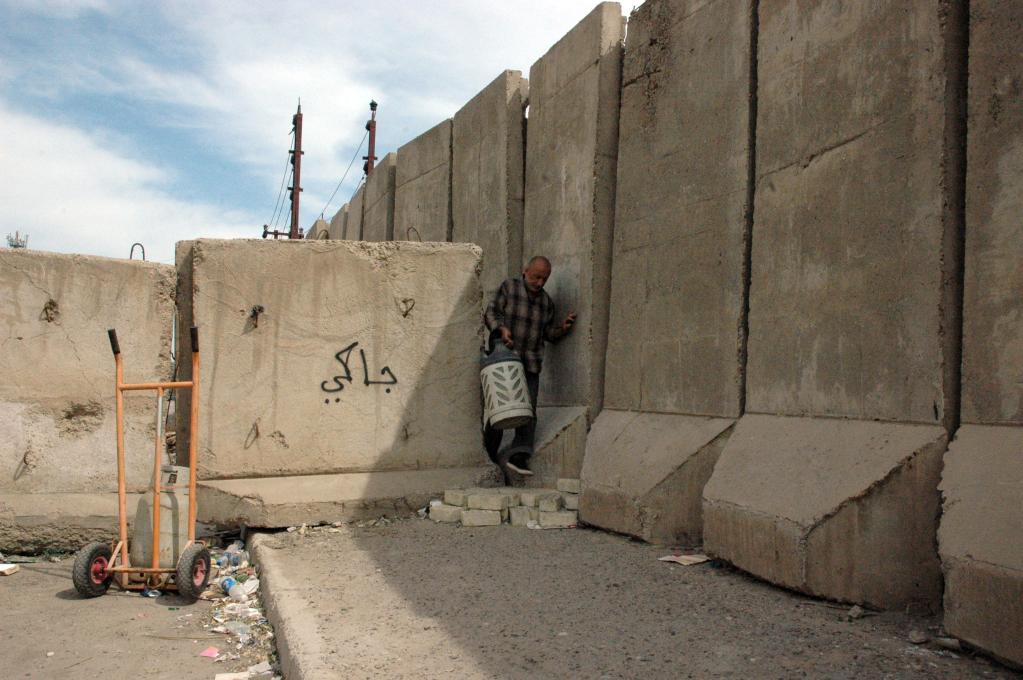 2013年3月20日,在伊拉克首都巴格達(dá),一名伊拉克人從防爆墻的縫隙之間穿過。新華社發(fā)(巴沙爾攝)