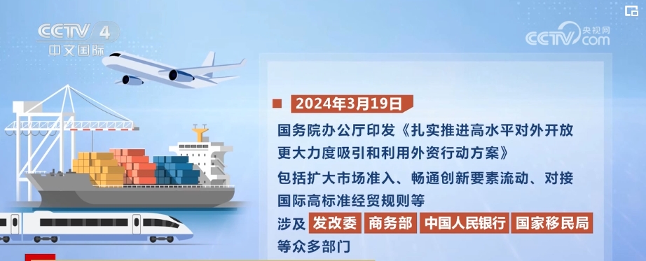 2024年3月19日,國務院辦公廳印發(fā)《扎實推進高水平對外開放 更大力度吸引和利用外資行動方案》,包括擴大市場準入、暢通創(chuàng)新要素流動、對接國際高標準經(jīng)貿(mào)規(guī)則等,涉及國家發(fā)展改革委、商務部、中國人民銀行、國家移民局等眾多部門。