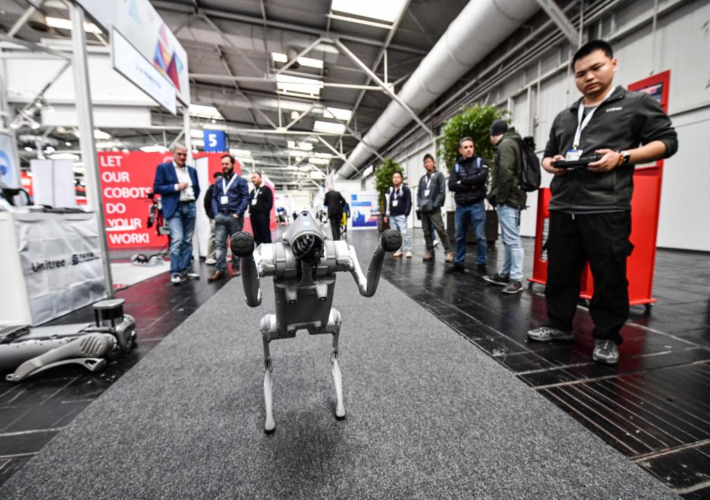 4月22日,在德國漢諾威工博會上,杭州宇樹科技有限公司參展商(右一)在展示一款機器狗。新華社記者任鵬飛攝