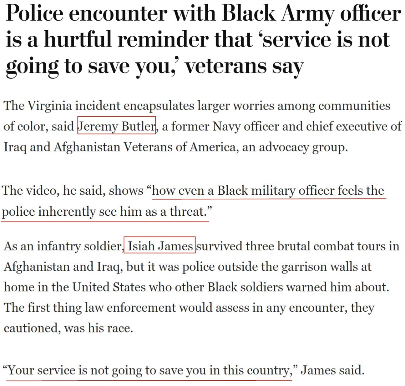 曾在阿富汗和伊拉克的三次殘酷戰(zhàn)斗中幸存下來的非裔美軍士兵伊塞亞·詹姆斯退役后,曾被其他非裔戰(zhàn)友“友情提醒”:打仗不是最可怕的,真正要小心的是美國(guó)警察,“在這個(gè)國(guó)家,即使在軍中服役也救不了你”。