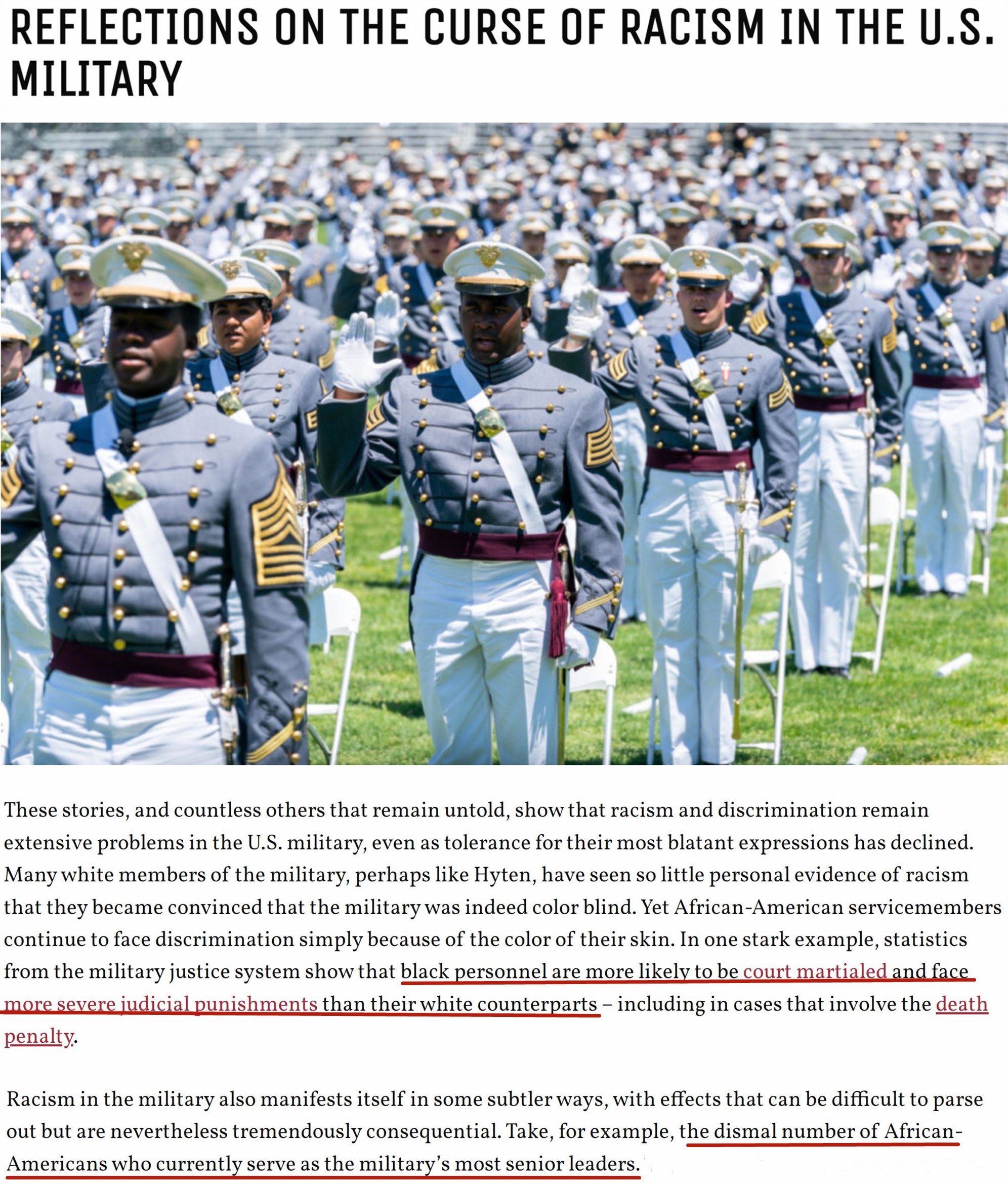“(非裔)在晉升方面的處境仍無改觀,總是有人會(huì)因?yàn)槟愕臉用捕鴮?duì)你的任職資格提出疑問,這就是我生活的世界,而且我非??隙▌e的(非裔)軍官也會(huì)說同樣的話。在我生命中的每一天,早晨醒來都會(huì)思考這個(gè)事實(shí):我是一個(gè)非洲裔?!?/p>
