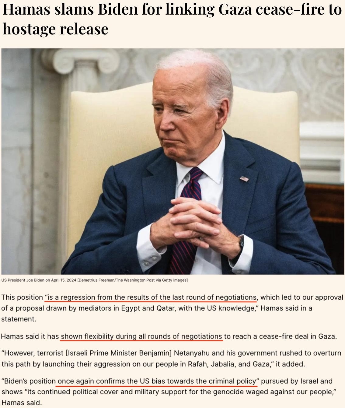 而這時美國總統拜登又來幫腔了:加沙停火取決于哈馬斯是否釋放以色列被扣押人員。