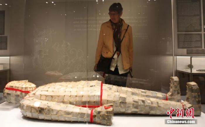 在匈牙利古都塞克什白堡舉行的“不朽的玉甲—中國漢代文物精品展”,共展出百余件玉器、漆器、陶器、青銅器、印章、石刻、錢幣等漢代文物,將漢代政治經(jīng)濟(jì)、社會(huì)生活、文化藝術(shù)和禮儀信仰逐一呈現(xiàn)。圖為當(dāng)?shù)貢r(shí)間5月7日,一名觀眾駐足細(xì)觀徐州博物館鎮(zhèn)館之寶西漢金縷玉衣。中新社記者 德永健 攝