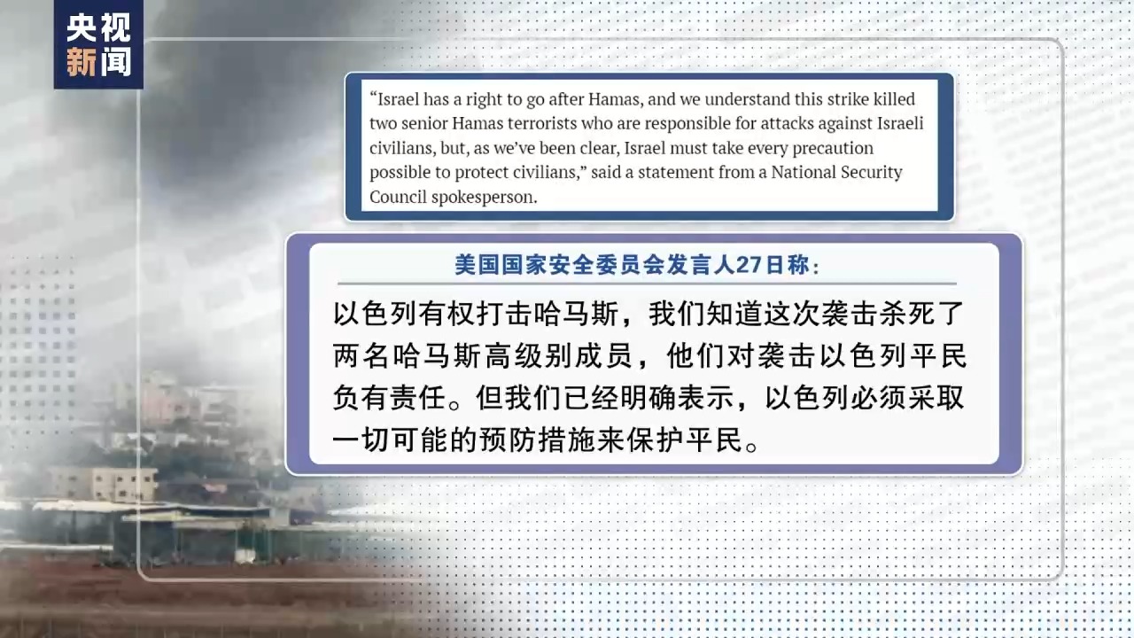 美國國家安全委員會發(fā)言人27日稱:以色列有權(quán)打擊哈馬斯,我們知道這次襲擊殺死了兩名哈馬斯高級別成員,他們對襲擊以色列平民負(fù)有責(zé)任。但我們已經(jīng)明確表示,以色列必須采取一切可能的預(yù)防措施來保護(hù)平民。