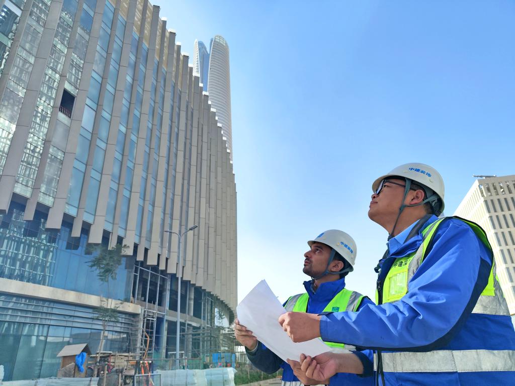 2023年11月27日,中建深圳裝飾有限公司項(xiàng)目經(jīng)理徐笑笑(右)與來(lái)自埃及的幕墻工程師艾哈邁德·賽義德在埃及開羅以東的埃及新行政首都中央商務(wù)區(qū)施工現(xiàn)場(chǎng)一同查看幕墻安裝進(jìn)度(手機(jī)拍攝)。新華社發(fā)(中建深圳裝飾有限公司供圖)