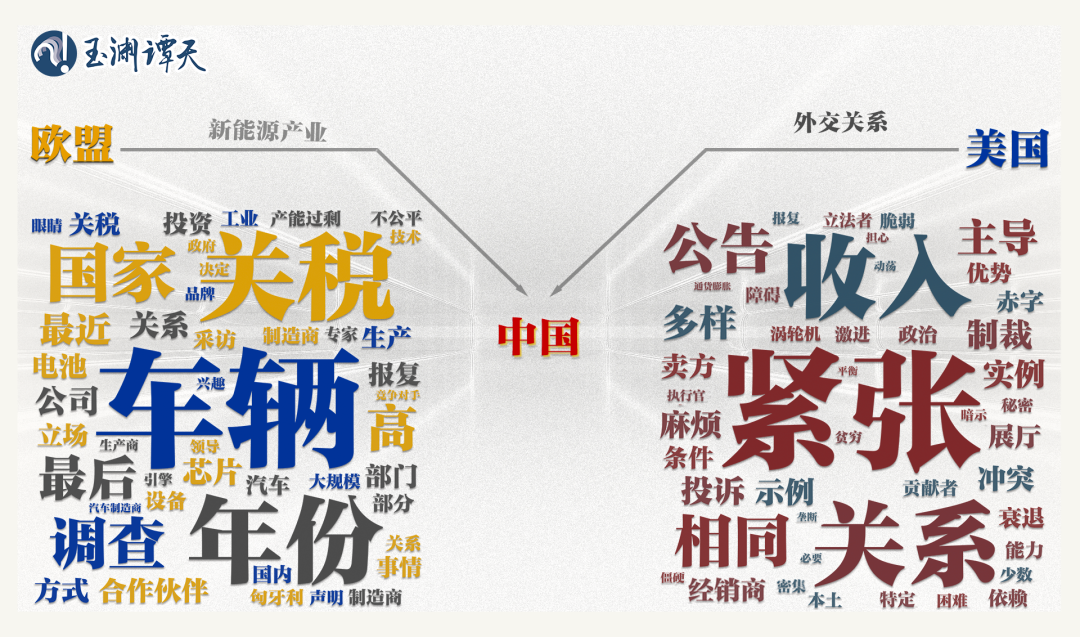 可以看到,以“車輛”“部門(mén)”“公司”“制造”等詞為代表的關(guān)鍵詞,都指向了新能源行業(yè)。相比之下,美國(guó)媒體對(duì)同一話題的討論,更側(cè)重“緊張”“關(guān)系”“沖突”“政治”等指向外交關(guān)系的關(guān)鍵詞。