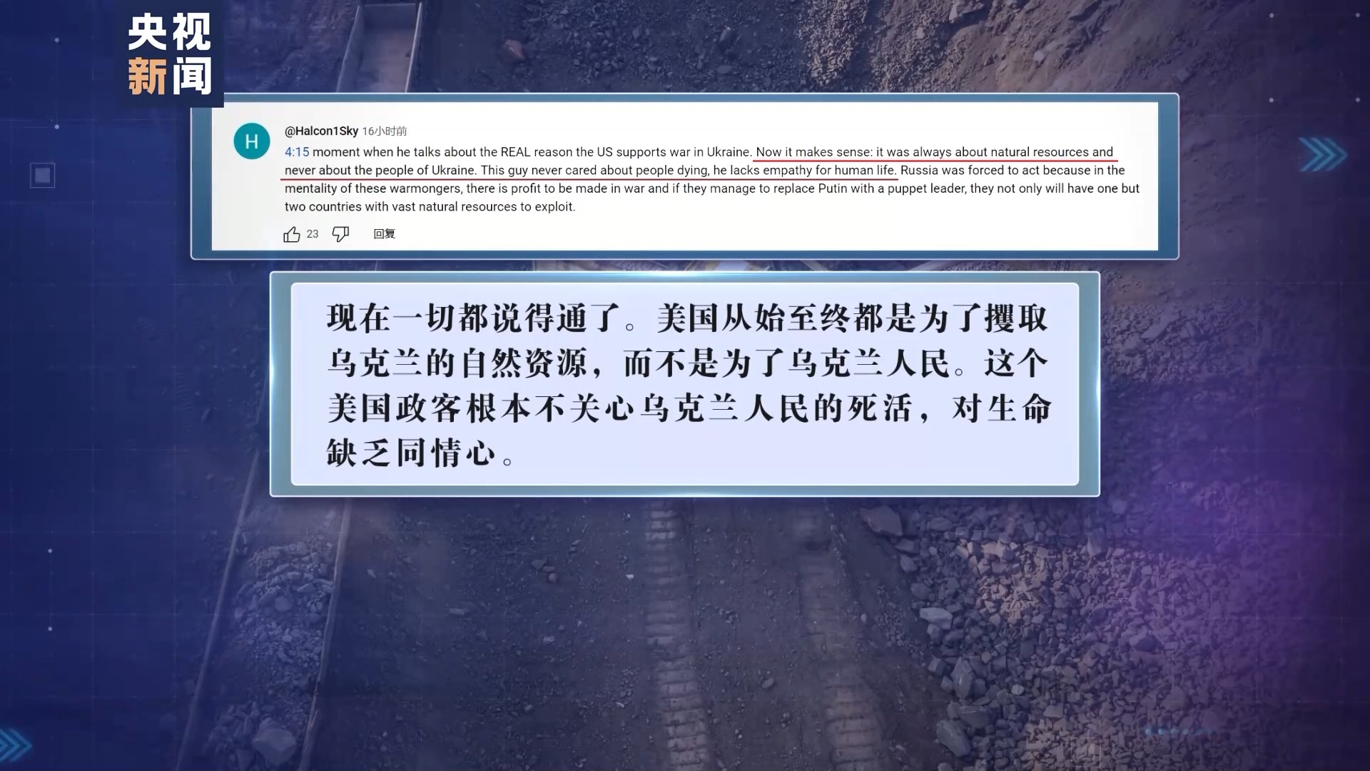 美國(guó)政治分析人士 諾亞·卡拉斯維克:這一直是西方幫助烏克蘭的目的。他們對(duì)做“商業(yè)伙伴”不感興趣,他們只是想榨取烏克蘭的資源,把烏克蘭人當(dāng)子彈用。